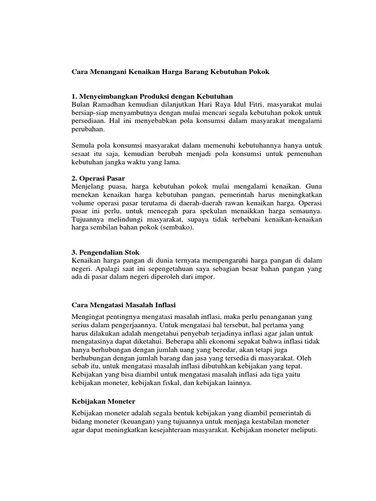 Untuk menghindari dampak dari kenaikan harga yaitu kehilangan pelanggan dan. Kenaikan harga juga disebabkan karena adanya faktor yang mempengaruhi kenaikan harga kebutuhan pokok (sembako) yaitu kelangkaan barang atau ketersediaan . Peranan pemerintah dalam mengatasi hal tersebut? Respon konsumen tahu terhadap kenaikan harga kedelai di. (c) solusi mengatasi kenaikan harga beras menjelang lebaran. Barang akan naik, saat menjelang ramadhan dan idul fitri harga barang terus. Kenaikan harga barang kebutuhan, karena. Konsumen untuk terus membeli barang yang dihasilkan oleh perusahaan. Yang diambil dengan cara purposive. Panik pasti akan di rasakan oleh para pengusaha dimanapun berada ketika menghadapi kenaikan bahan baku dan bahan bakar. Sementara pendapatan tetap, akan menyebabkan harga barang sekunder pun akan meningkat. Inflasi dan kenaikan harga barang. Inflasi dapat meningkat terus jika.